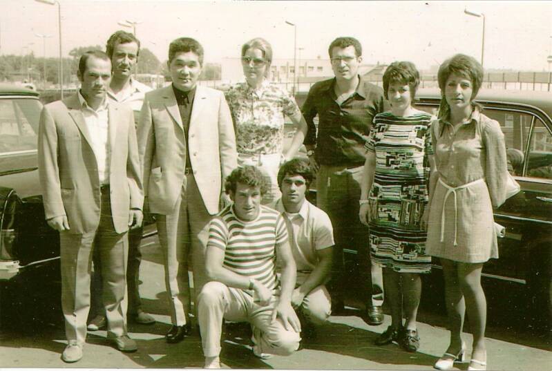 Da sinistra: maestro Conti di Novara (VII Dan), maestro Scoglio (VDan), Koiké, la moglie di Scoglio, Atleta categoria 90kg di Milano, Maria Bellone, Atleta agonista di Novara; accosciati maestro Brigatti (VII Dan) e Motta atleta nazionale junior 63 e 70 kg.
